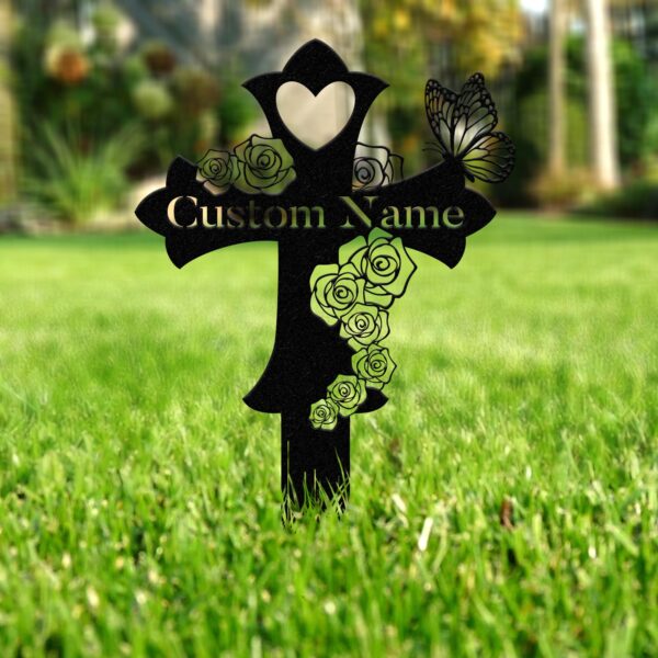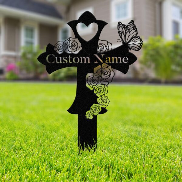 Custom Butterfly Memorial Cross Stake Metal, Cross with Hearts, Butterfly Garden Stakes, Grave Marker, Mother’s Day Gift, In Memory of Gifts Vs2