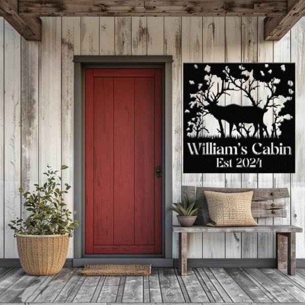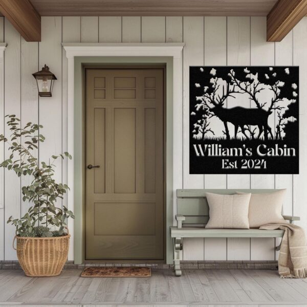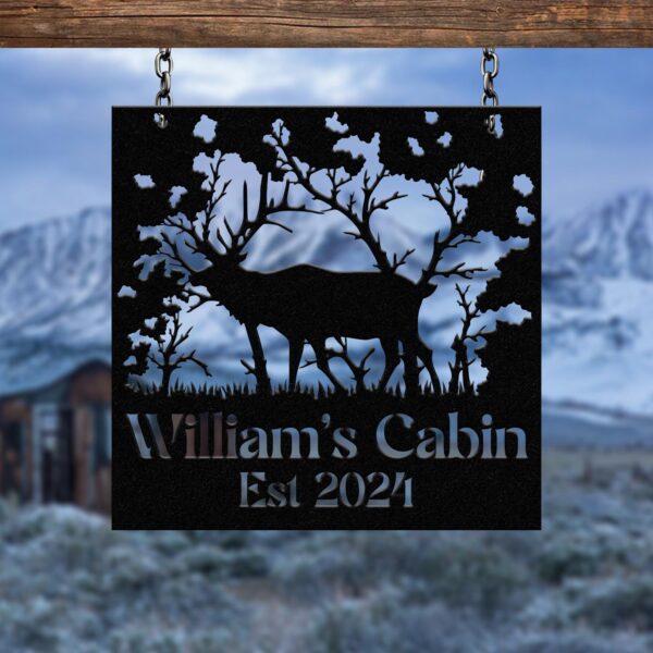 Custom Name Elk Cabin Sign, Outdoor Metal Elk Sign with Mountain, Hunting Gift, Metal Nature Wall Art Mountains Trees Wildlife Lover Gift